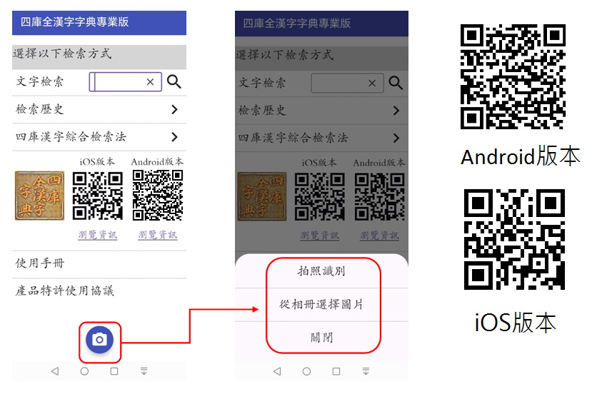 《四庫全漢字字典》手機應用程式最新增加了「相片識別」功能,使用戶檢索文字時更方便。用戶只需要啟動相機拍照功能,拍下要查閱的文字或按從「相冊選擇圖片」,即可檢索出相關文字,使用戶在閱讀時更便利。 用戶需要更新程式才能使用新增功能,iOS或Android用戶只需進入「App Store」或「Google Play」,輸入「skqs」或「四庫全漢字字典」等進行程式更新即可。如對《四庫全漢字字典》有 ...
